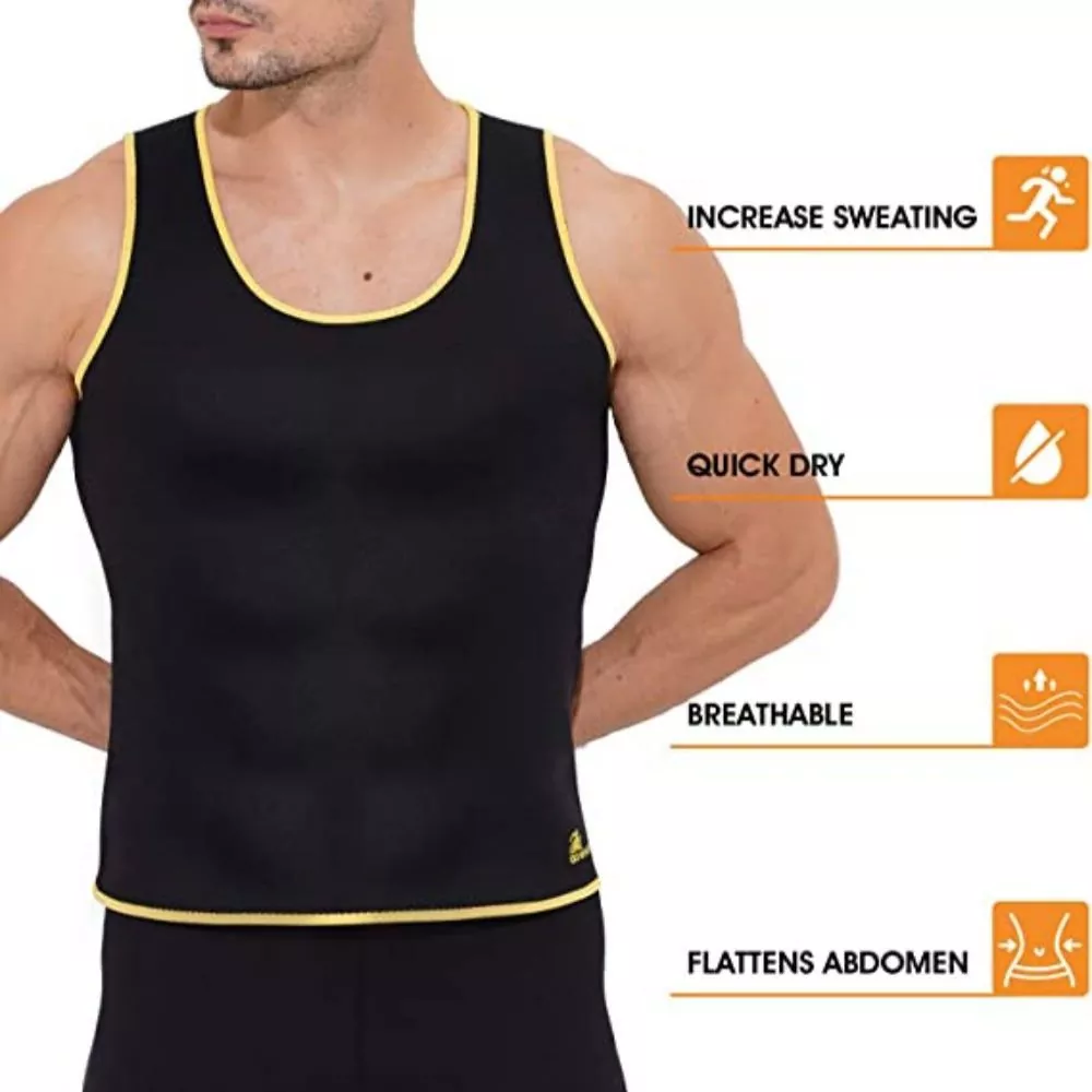 Tummy trimming trimming pria, oem Shormewear sauna vest kain polimer thermogenem nambah suhu inti sampeyan kanggo promosi kringet. Kain kompresi kompresi njaba Langsing lan mbentuk ndhuwur, nggawe sampeyan katon luwih ramping lan olahraga, olahraga, olahraga, mlaku-mlaku, mlaku-mlaku wengi. Top fitness iki gampang dicocogake kanthi apik karo celonone sauna, kathok cendhak sauna lan bras olahraga.
